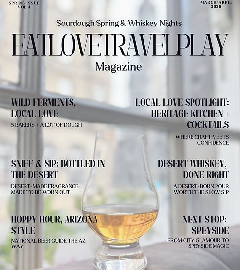 The newest EatLoveTravelPlay™ issue is your guide to a March–April mood shift: Sourdough Spring & Whisky Nights, patio weather that begs for a reservation, and just enough wanderlust to keep things interesting. Meet Arizona’s perfumers in Sniff & Sip: Bottled in the Desert, then follow the aroma trail into Wild Ferments, Local Love, where five bakers bring big dough energy and sourdough dreams to life. From Desert Whiskey, Done Right to Hoppy Hour, Arizona-Style, this issue is built for slow sips, crisp pours, and a little “one more stop” energy.